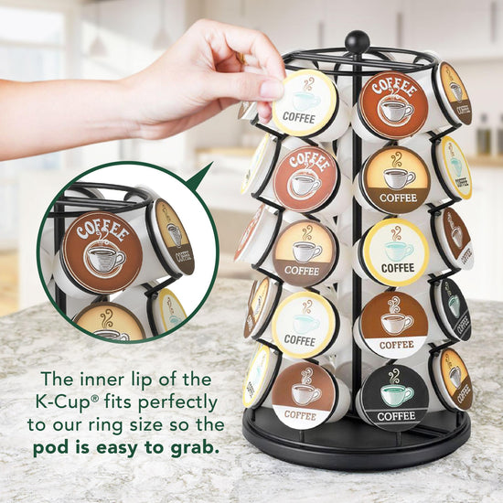 - COFFEE POD CAROUSEL: This Nifty carousel is compatible with K-Cups and stylishly showcases up to 35 of your favorite coffee pods. The lazy Susan base platform revolves and spins 360-degrees, which makes it simple and convenient to find and choose your preferred flavor.