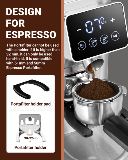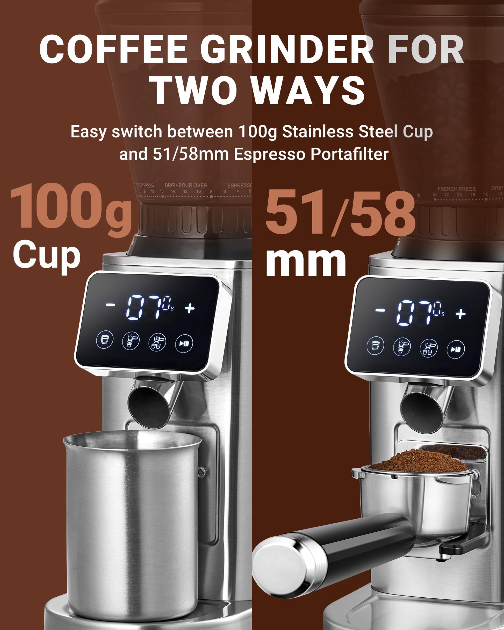 - DESIGN FOR ESPRESSO:We provide portafilter holder ,Portafilter holder pad and stainless steel Cup . It is compatible with 50mm Espresso Portafilter. The 100g stainless steel cup capacity ensures the perfect amount of coffee for each brewing, guaranteeing rich and flavorful coffee beans for a fresh and healthy grinding experience.