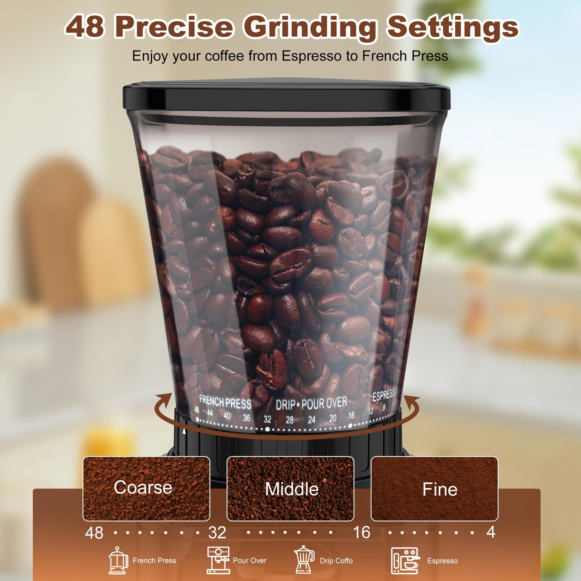 - 【48 Adjustable Grinding Settings & Precision Grinding Timer】: With 48 adjustable grinding settings, this portable coffee grinder allows you to adjust the grind fineness to suit your preferred brewing method: espresso, dripping, cold brew, or french press, meet your all grinding needs. The precision grinding timer allows you to adjust grind time up to 35 seconds. Press the button to start grinding, and it will stop grinding automatically when the time is reached.