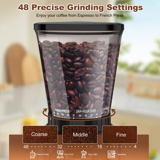 Conical Burr Coffee Grinder: Anti-Static Electric Coffee Bean Grinder with Adjustable 48 Grinding Settings and Precision Timer,Portable Stainless Steel Coffee Grind for Espresso/Drip/French Press