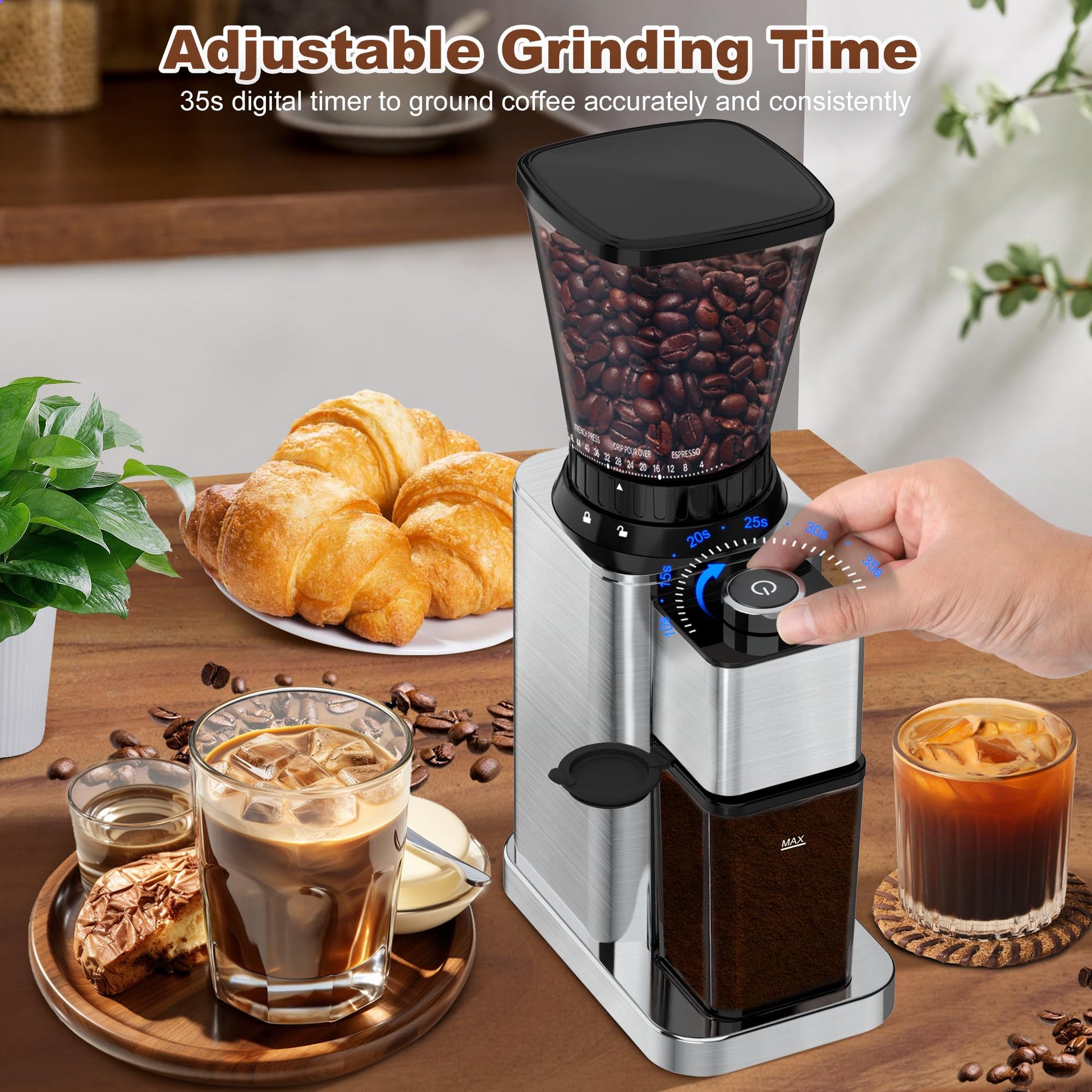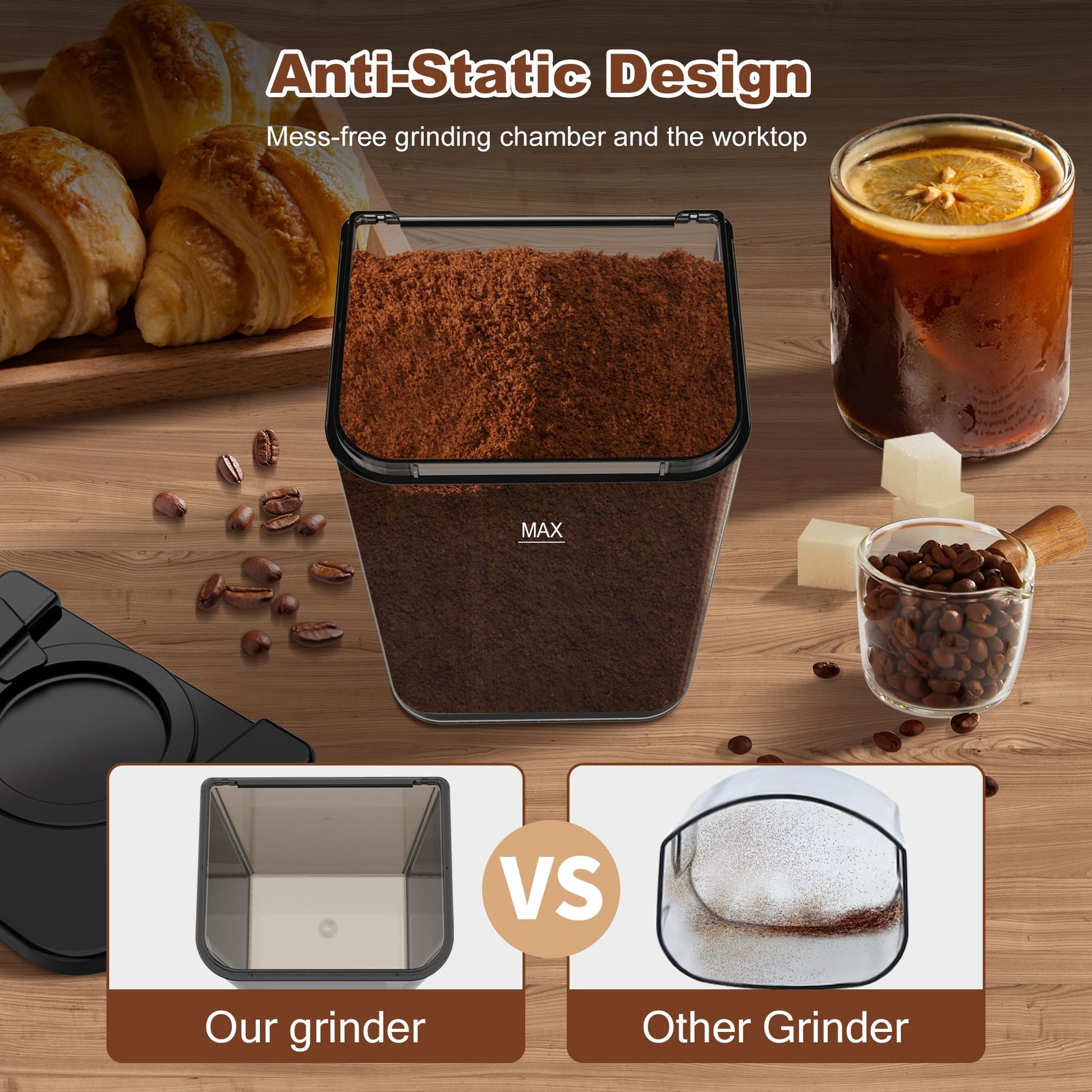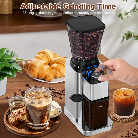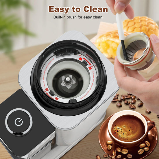 - 【Anti-Static Technology & Easy to Clean】:This burr coffee grinder is designed to revolutionize the grinding experience. Our anti-static technology prevents the coffee grounds from sticking to the coffee chamber and creating a mess. The improved built-in brush gives you precision cleaning for residual grounds inside without clogging to ensure a natural coffee flavor every time. And the built-in brush, hopper, removable upper burr, and chamber for easy cleaning of the item.