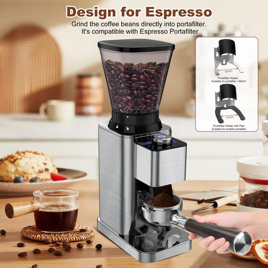 - 【Design for Espresso & Portafilter Holder】: Equipped with a portafilter holder which is suitable for portafilter. (Portafilter not included). You can grind coffee beans directly into the portafilter, which could save your time and help make Espresso coffee with ease.